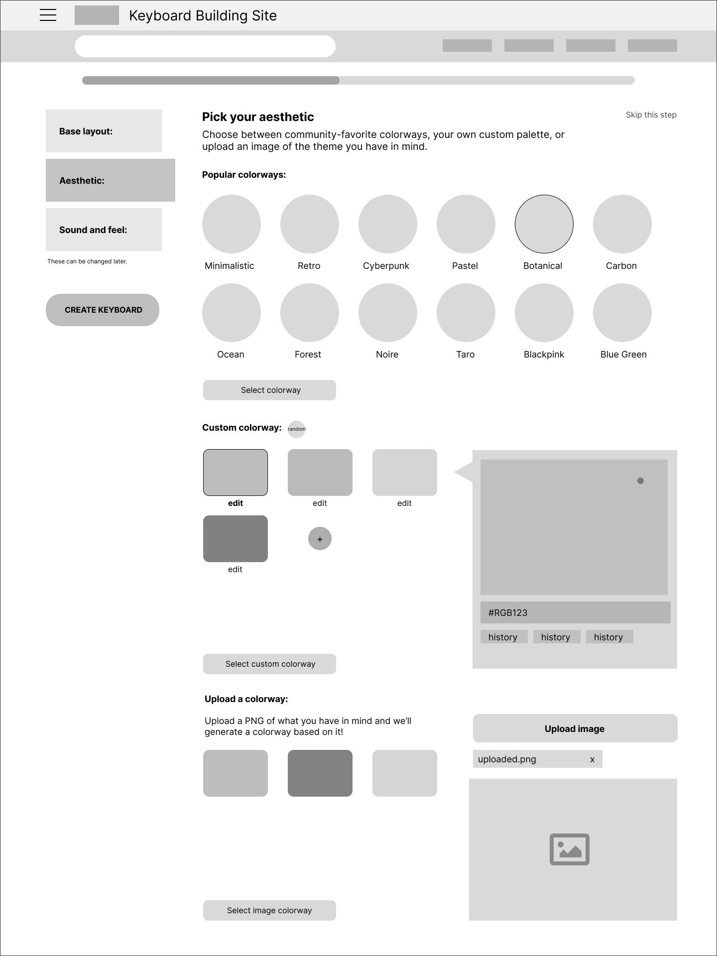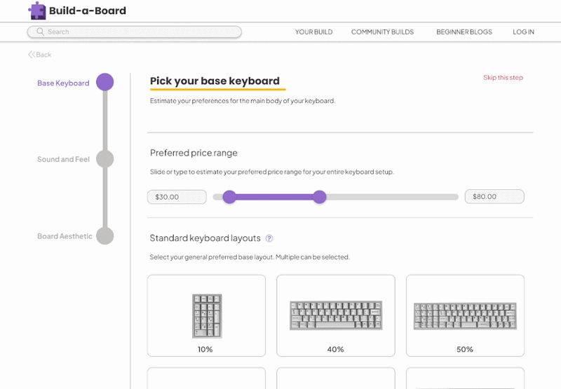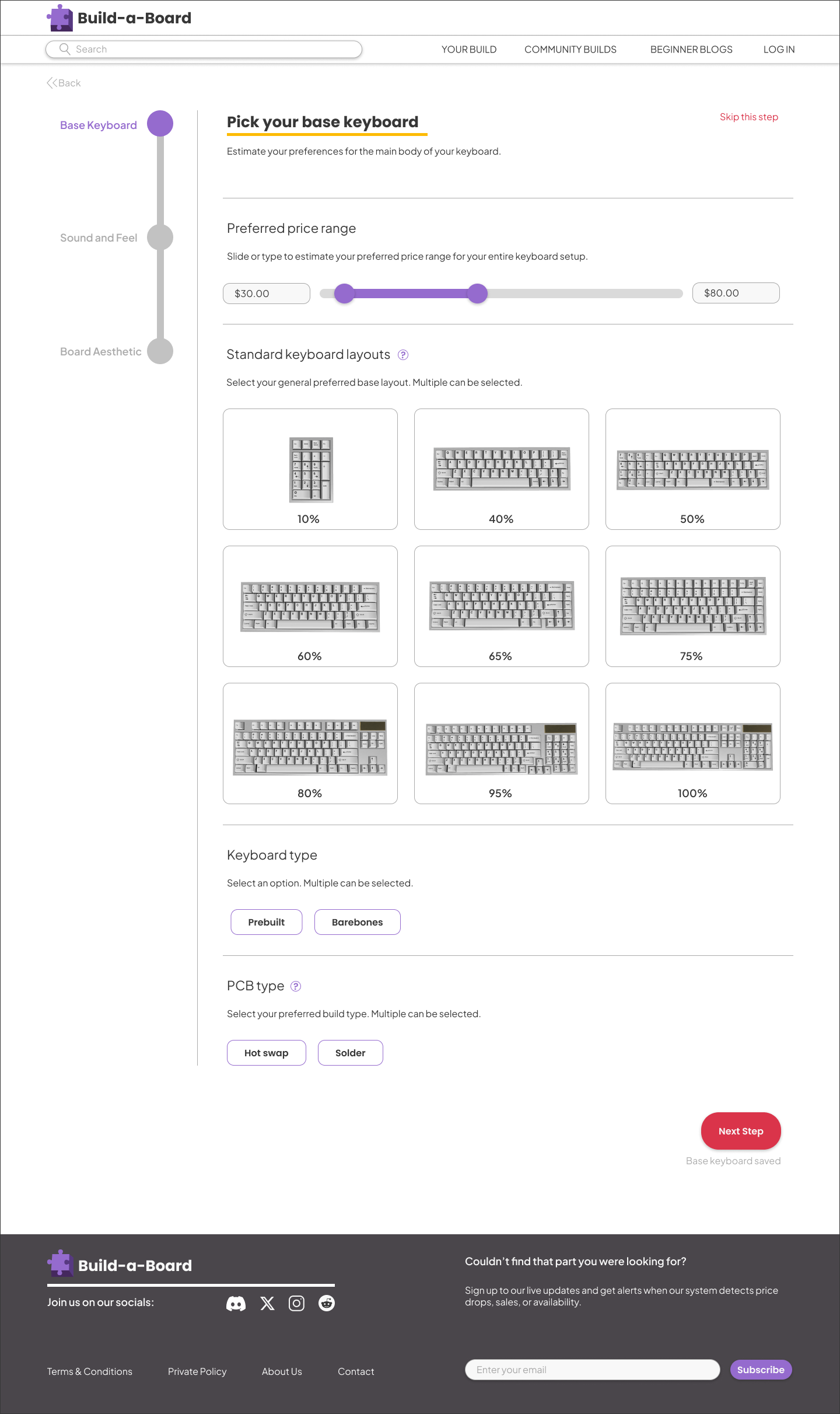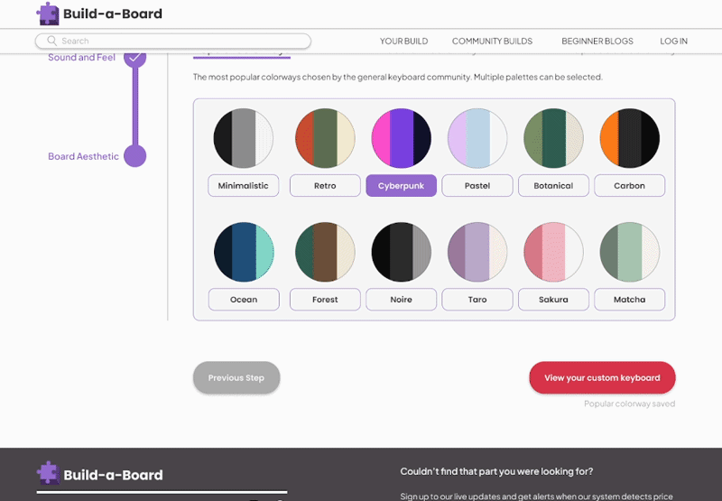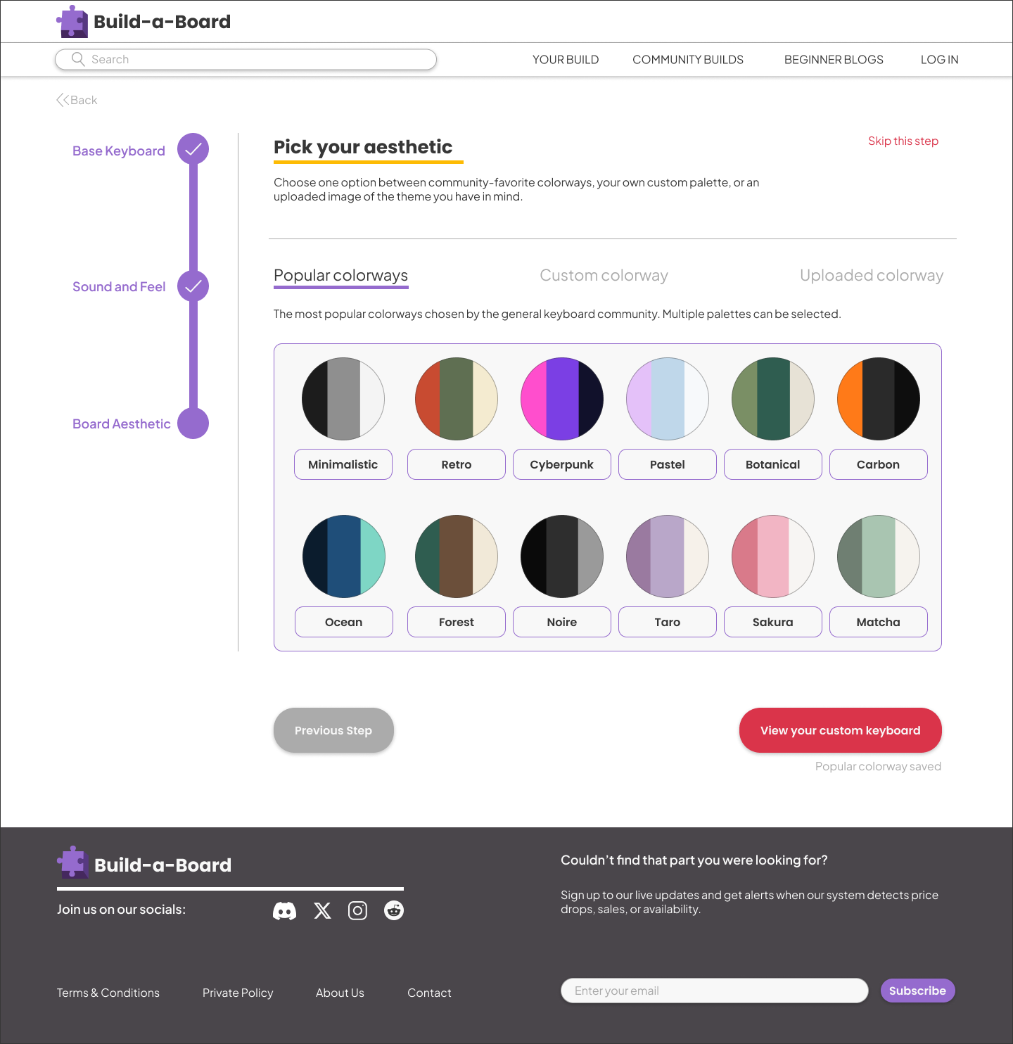 Intuitive and straightforward, I designed Build-a-Board to be welcoming for newcomers to custom keyboards. The step-by-step nature of picking preferences makes it so users are able to filter parts based on their desired board size, sound and feel, and aesthetic theme.