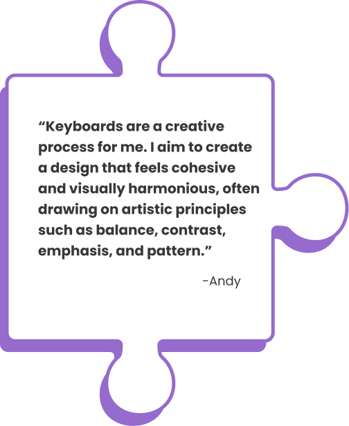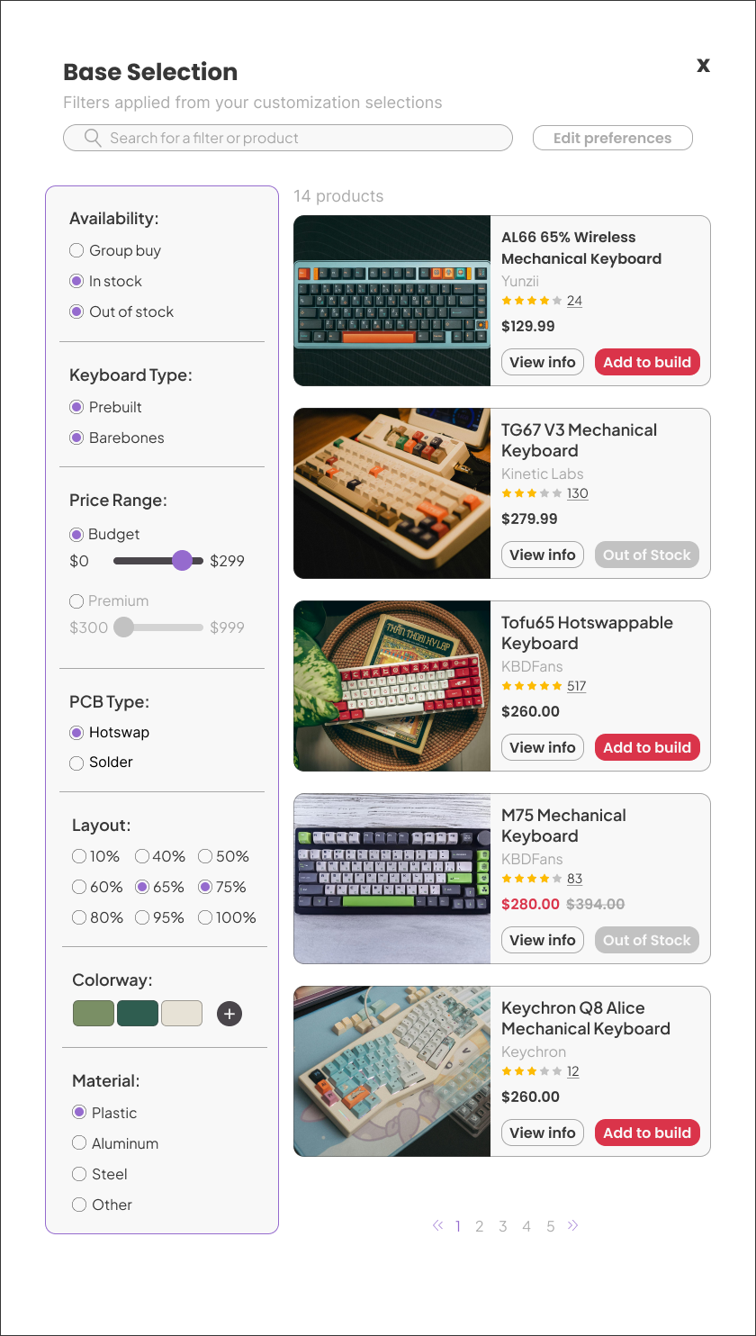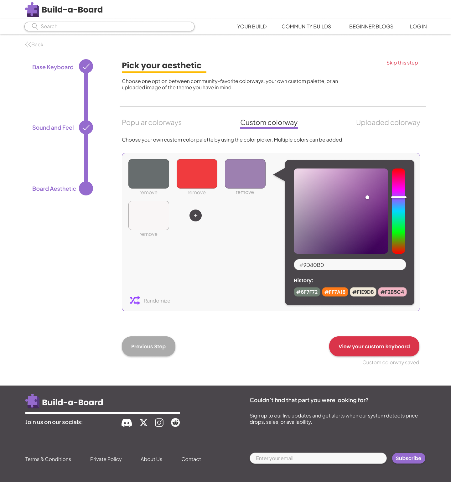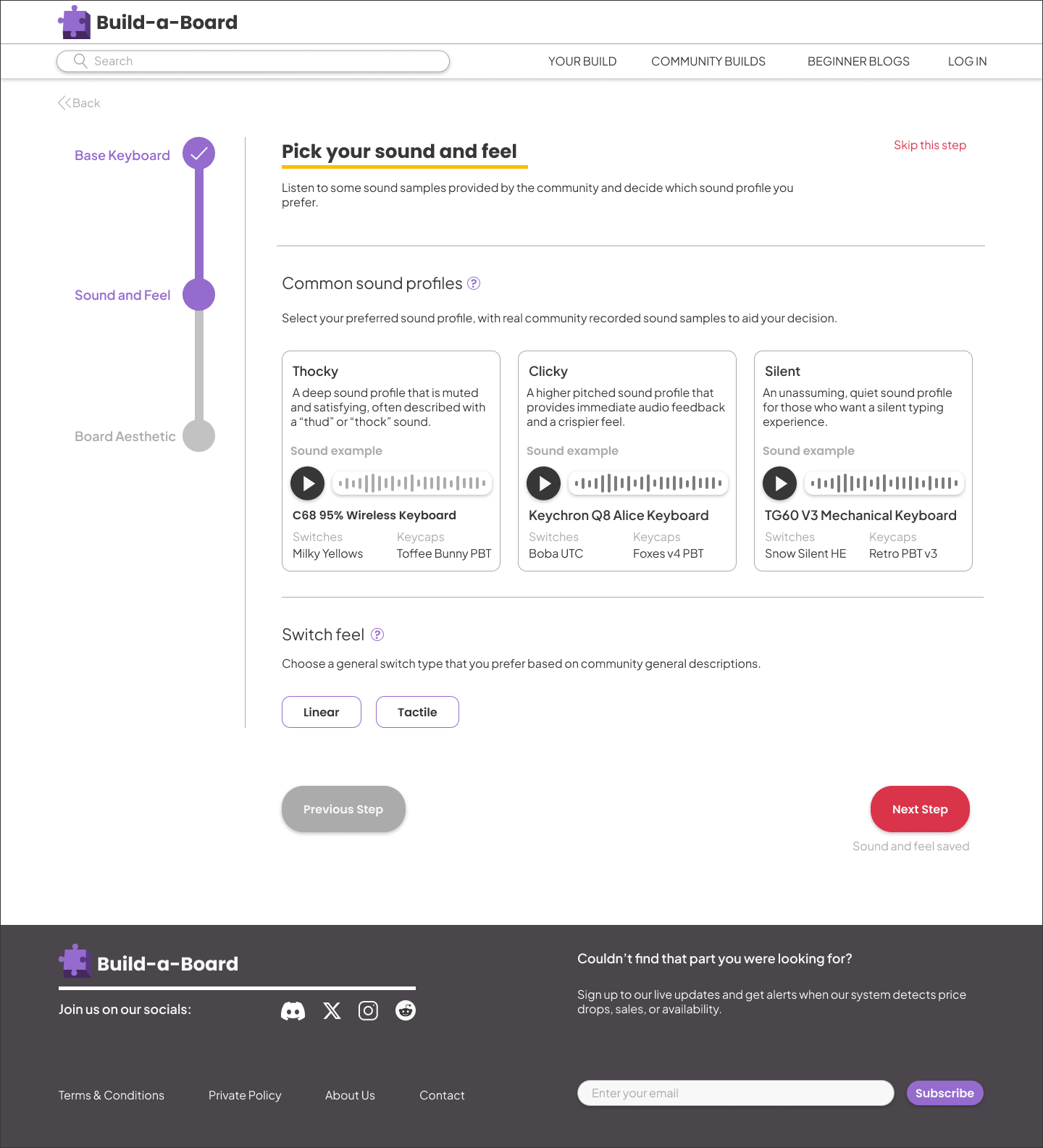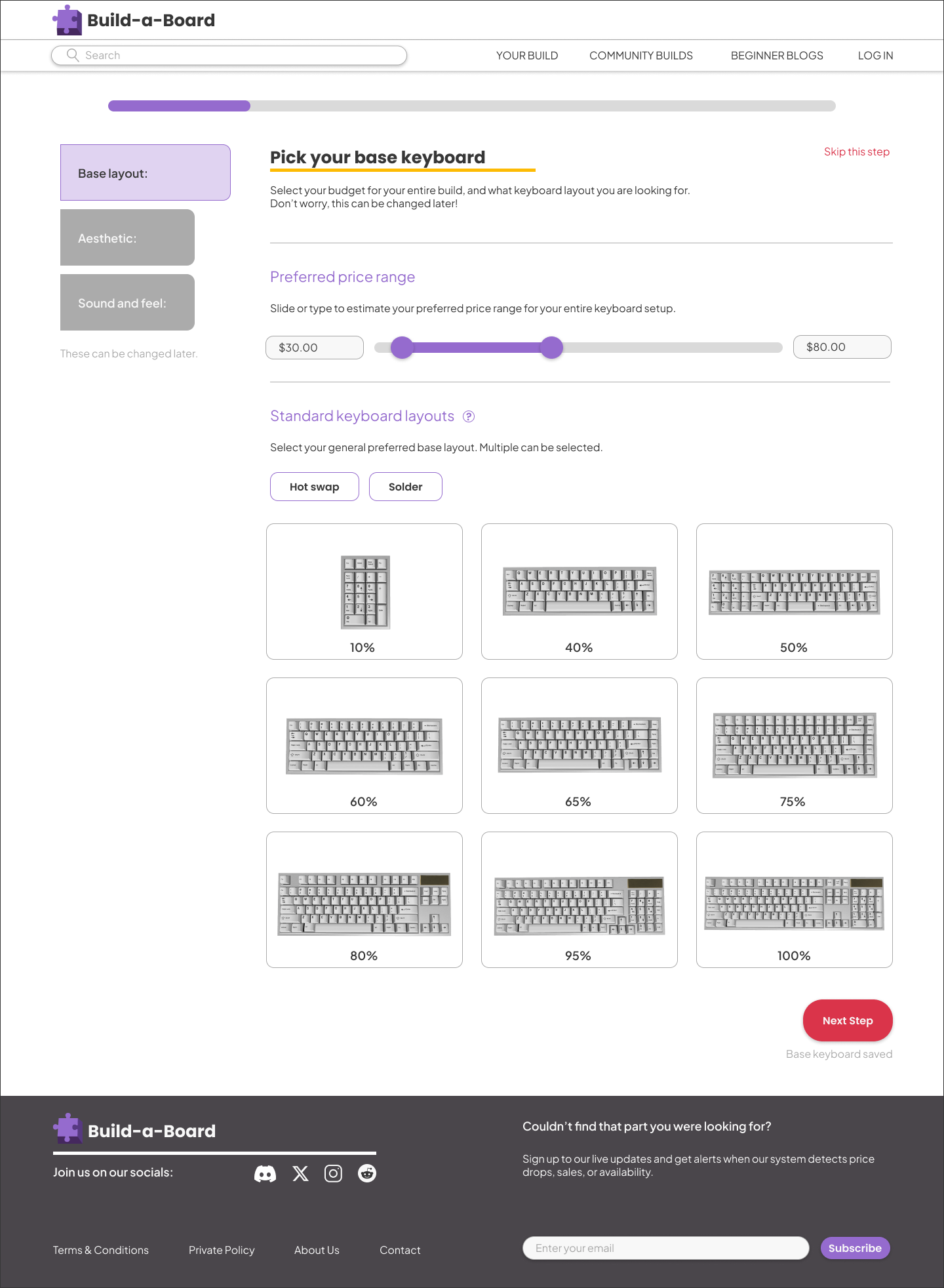 Intuitive and straightforward, I designed Build-a-Board to be welcoming for newcomers to custom keyboards. The step-by-step nature of picking preferences makes it so users are able to filter parts based on their desired board size, sound and feel, and aesthetic theme.
