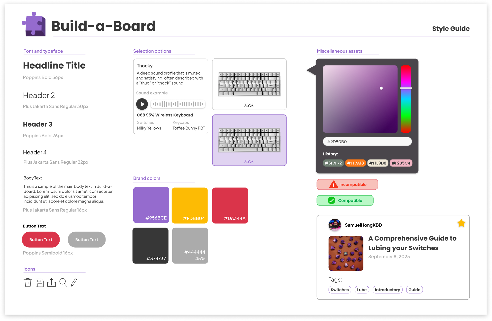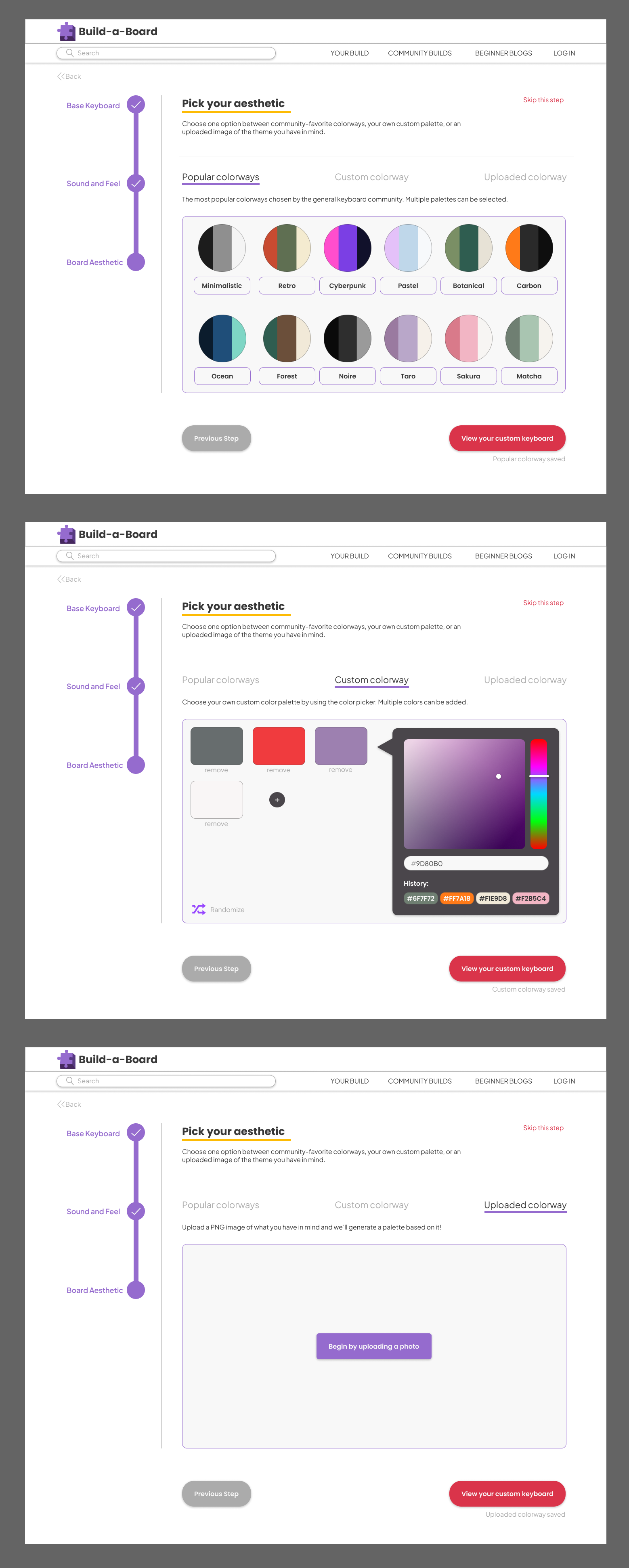 Custom keyboard building is complex, with subtle nuances that set it apart from the more modular, pick-and-choose nature of PC building. Although my initial idea was to help beginners list together keyboard parts with compatibility indicators and stock notifiers, I felt that it would not serve as an effective tool to satisfy my newcomer personas’ aesthetic goals. Thus, I focused on three main features for Build-a-Board: