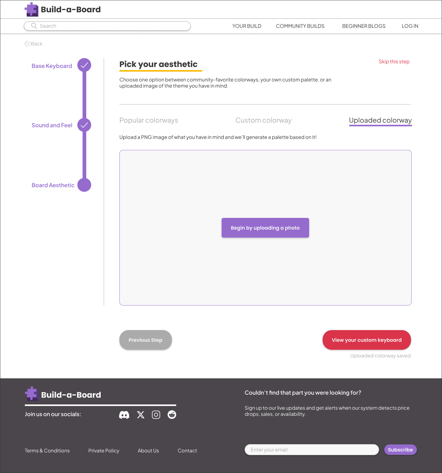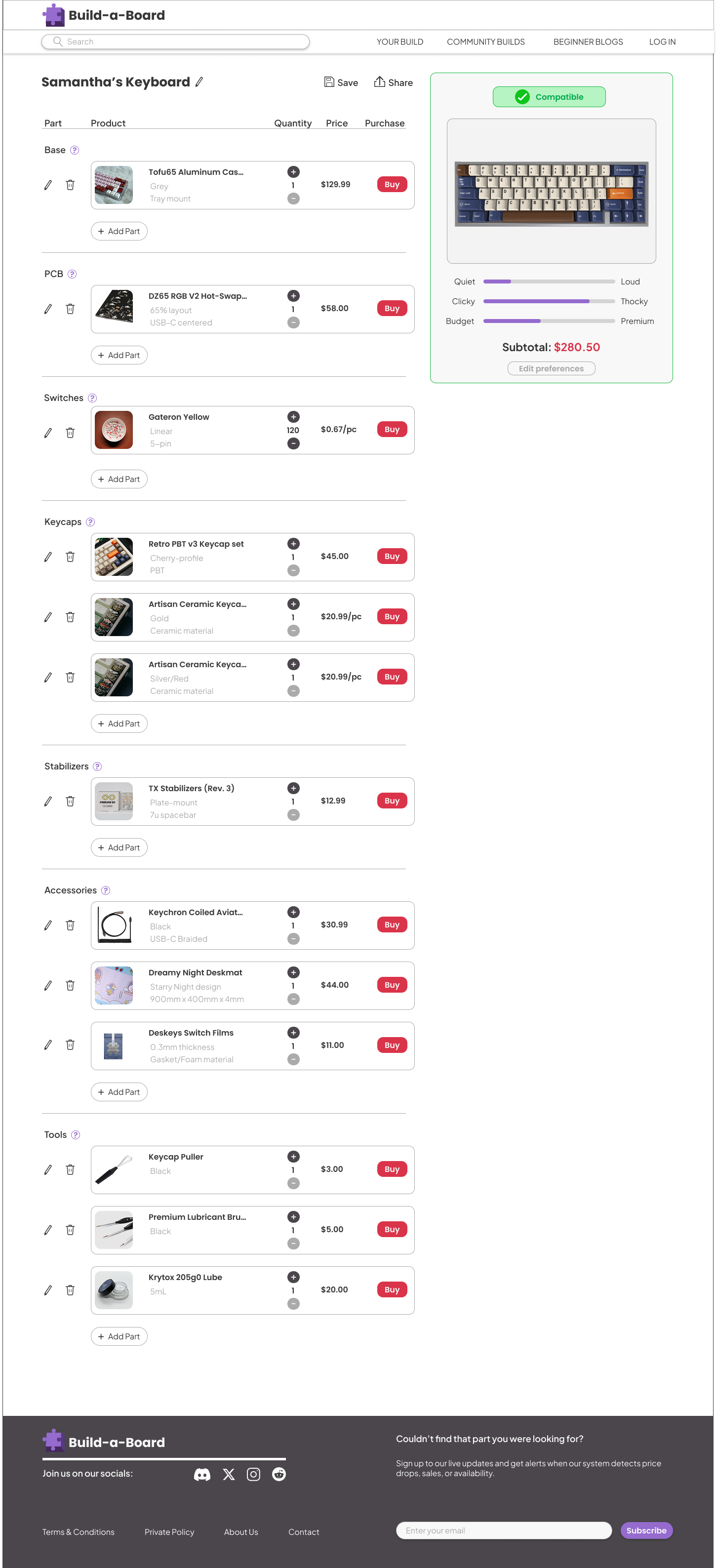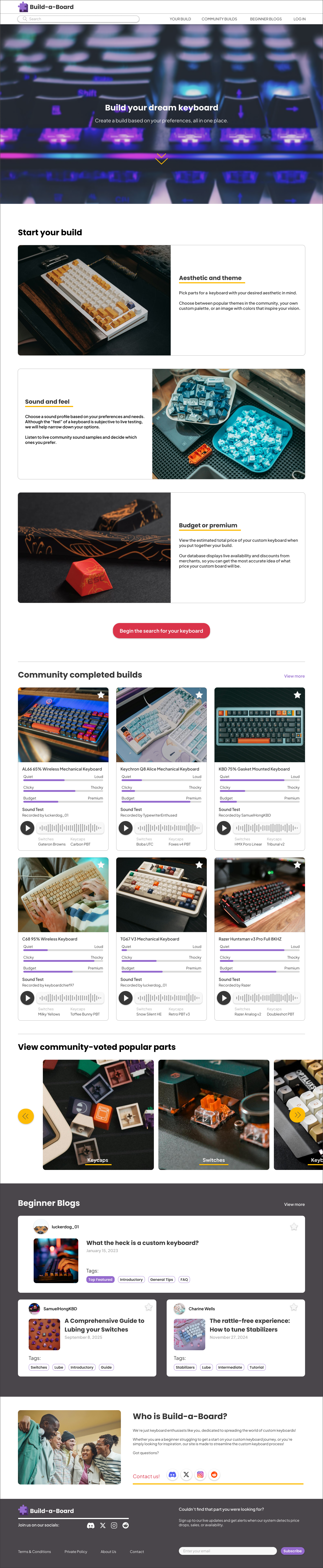 As of now, Build-a-Board is primarily focused on the process of selecting keyboard parts. Other major features, such as an extensive community environment and helpful tutorial blogs will be expanded on upon further development in the future.