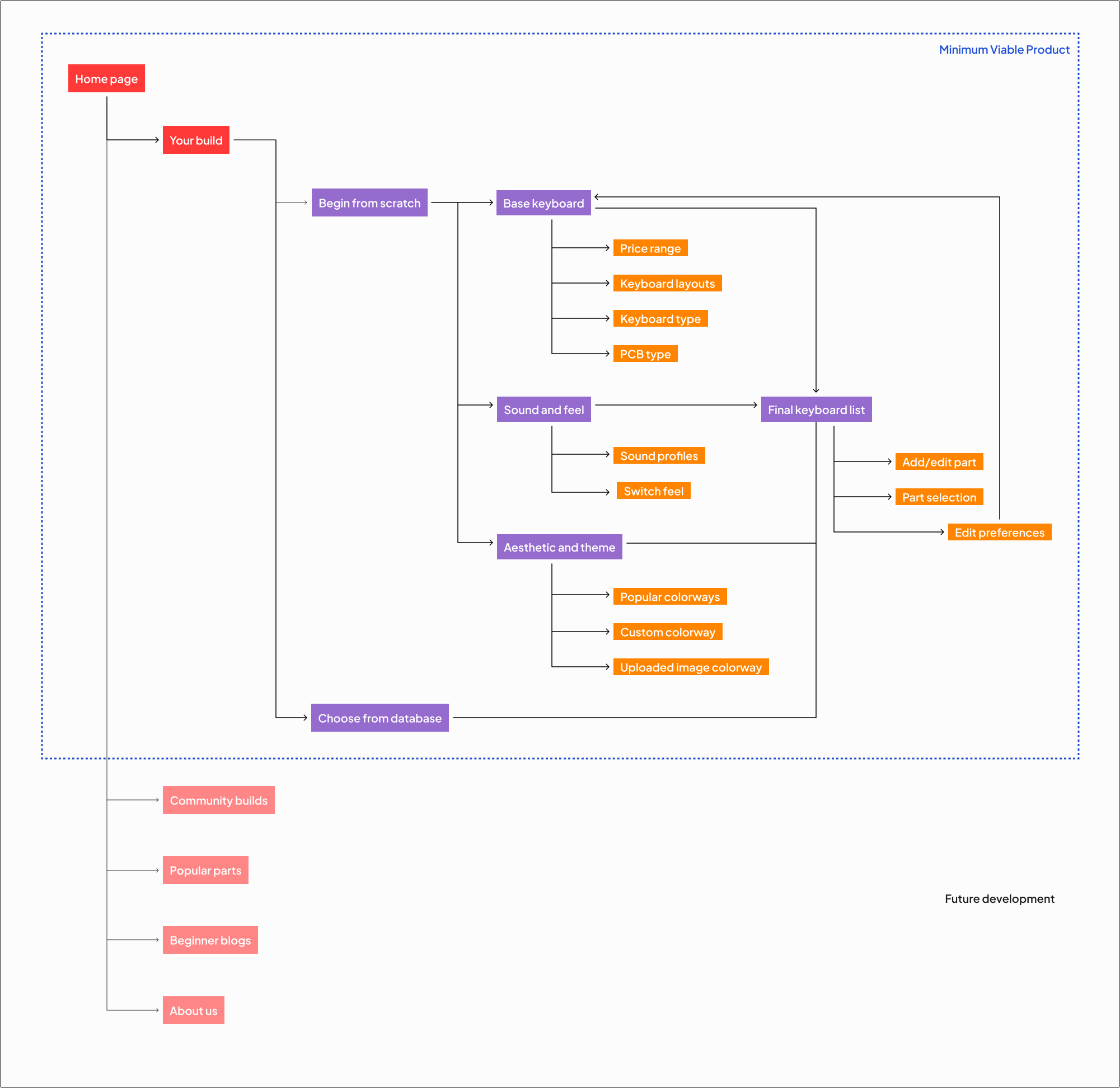 To begin the process of Build-a-Board, I created a sitemap designed to help users realize their goal of accumulating all the complete keyboard parts necessary for their build. I considered flexibility in a user’s task flow, allowing them to prioritize any section they deem as important.