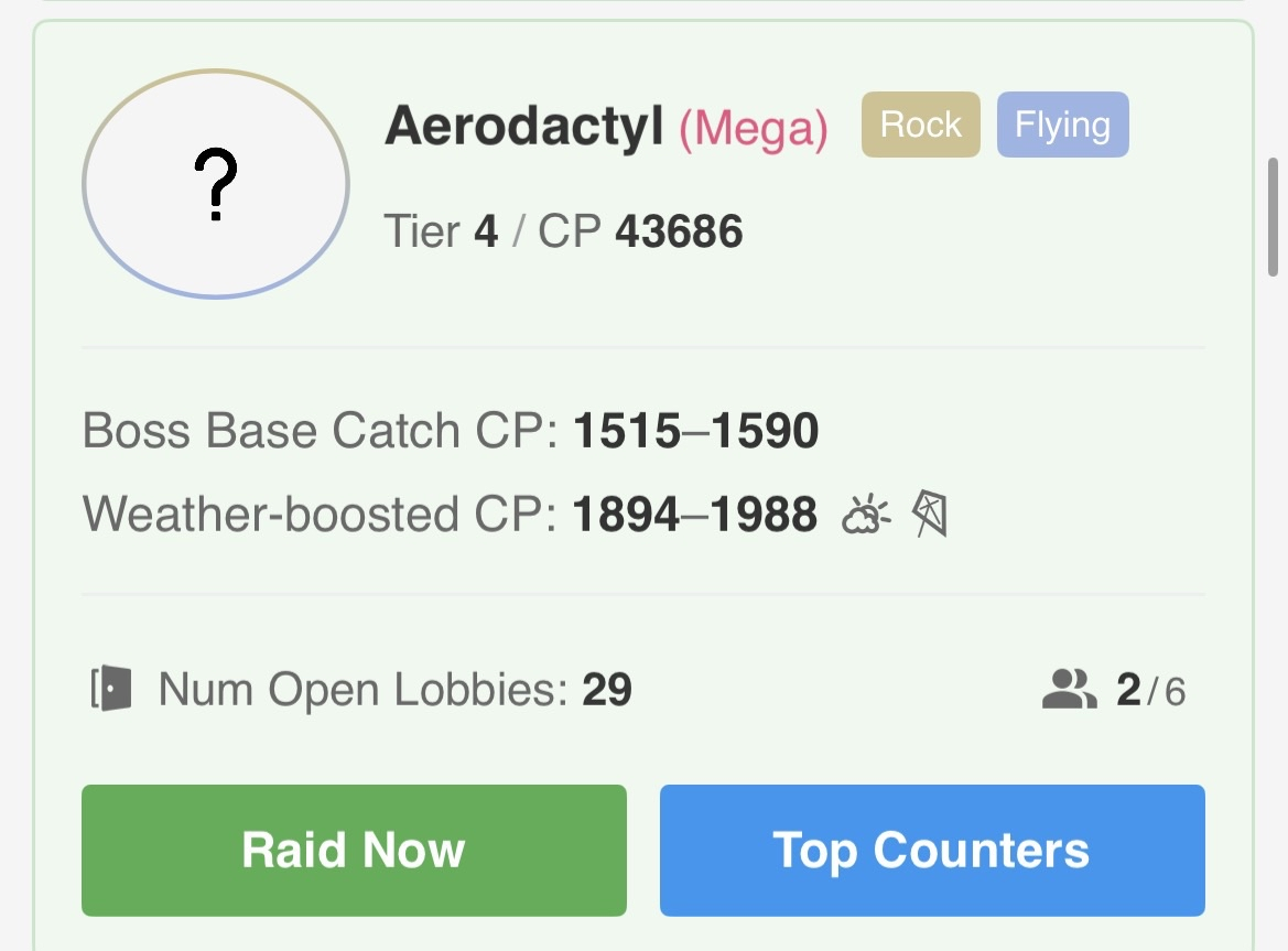 Poke Genie has inconsistent information that puts a strain on cognitive load. There are values missing in different listings; while icons appear to be used with certain raids like Dynamax and Shadow, the app forgoes using an icon in others such as Mega or regular.